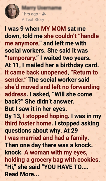 One evening, after putting Emma to bed, I heard it—knock, knock, knock. On the porch stood a frail woman with gray hair, clutching a grocery bag of cookies. Her eyes stopped me cold. They were my eyes.