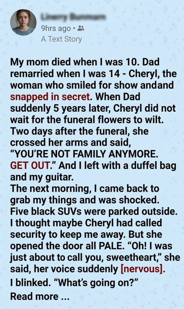 Cheryl started screaming as the guards stepped onto the porch, but I didn’t watch. I walked past her, past the fake tears and the greed, and stepped back into my father’s house. I set my guitar down in the hallway. I was finally home, and for the first time in five years, the air felt clear.