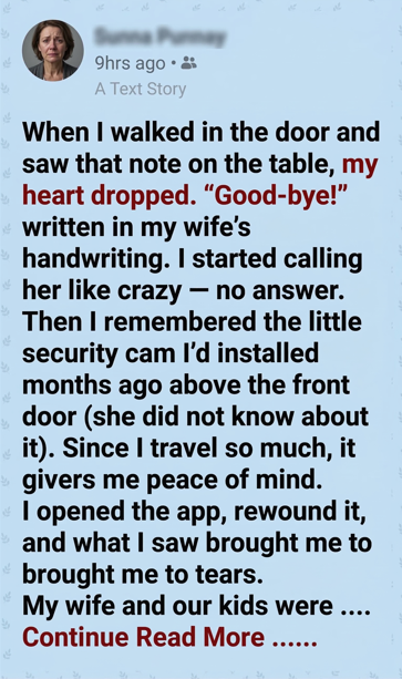 When I walked in the door and saw that note on the table, my heart dropped. “Good-bye!” written in my wife’s handwriting. I started calling her like crazy — no answer. Then I remembered the little security cam I’d installed months ago above the front door (she did not know about it). Since I travel so much, it gives me peace of mind.
