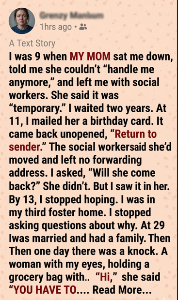 I was 9 when MY MOM sat me down, told me she couldn’t “handle me anymore,” and left me with social workers. She said it was “temporary.” I waited two years. At 11, I mailed her a birthday card. It came back unopened, “Return to sender.” The social worker said she’d moved and left no forwarding address. I asked, “Will she come back?” She didn’t answer. But I saw it in her eyes. By 13, I stopped hoping. I was in my third foster home. I stopped asking questions about why. At 29 I was married and had a family. Then one day there was a knock. A woman with my eyes, holding a grocery bag with cookies. “Hi,” she said “YOU HAVE TO…. Read More…