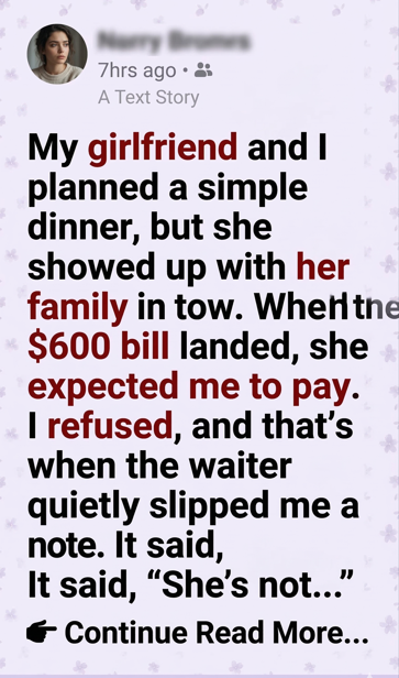 Nothing extravagant. Just a quiet Friday night at a mid-range restaurant downtown. We’d both had long weeks, and I thought it would be a nice chance to unwind, talk, and maybe discuss the next step in our relationship. We’d been together almost a year. I was starting to think about the future.