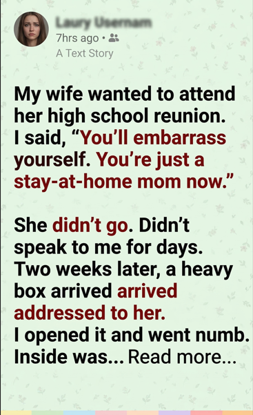She gave a small, sad smile. “Every time I talked about dreams or plans, you reminded me I was ‘just’ a stay-at-home mom. After a while, I stopped sharing.”