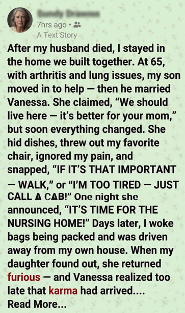 I never imagined my son and his wife would be the ones to turn me out of the home filled with my husband’s memory. But what happened next proved that betrayal never goes unanswered.