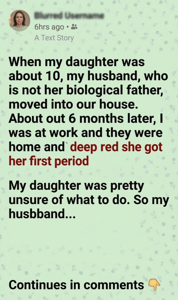 When my daughter was about 10, my husband, who is not her biological father, moved into our house. About 6 months later, I was at work and they were home when she got her first period. My daughter was pretty unsure of what to do.