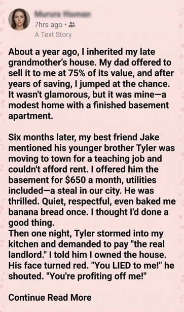 “Profiting off you?” I repeated slowly. “Tyler, you’re paying $650 a month. Utilities included. That barely covers the property tax and bills.”