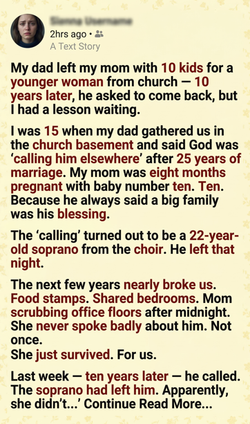 On a random Tuesday, my mom’s name lit up my phone at the exact time she should’ve been in class. She didn’t leave a long message, just one line that made my stomach drop. My father had called. The same man who disappeared from our lives a decade ago. And now, out of nowhere, he wanted to come home.