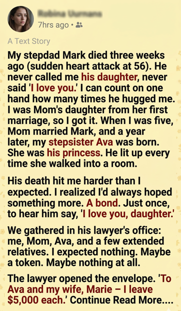 I wept. Not for the money, but for the recognition I’d craved my whole life. In the end, the man who never called me daughter gave me something more powerful than words—he gave me validation.