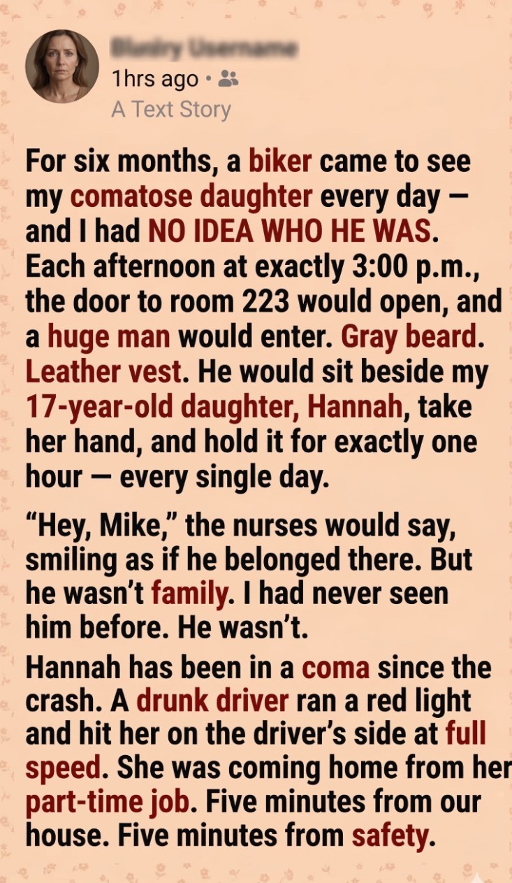 The biker would step in quietly, like he didn’t want to disturb the air itself. He was huge—broad shoulders, gray beard, leather vest that smelled faintly of gasoline and road dust. The nurses greeted him like an old friend.