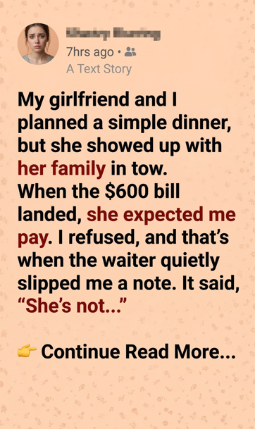 Nothing extravagant. Just a quiet Friday night at a mid-range restaurant downtown. We’d both had long weeks, and I thought it would be a nice chance to unwind, talk, and maybe discuss the next step in our relationship. We’d been together almost a year. I was starting to think about the future.