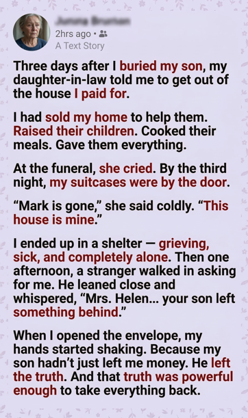 “Mom,” it began, in his familiar handwriting. “If you’re reading this, it means I didn’t get the chance to fix everything myself. I love my wife, but I’ve seen changes in her. I need to know you’ll be safe no matter what.”