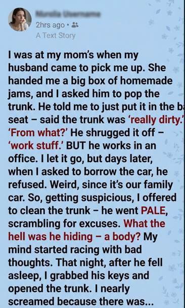 The air in the garage felt different. Too still. Like the car was holding its breath. I turned the key in the trunk lock and heard the soft mechanical click.