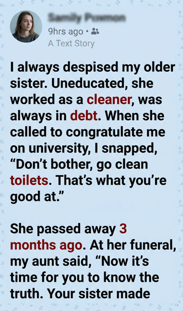 “She never got a proper education or a good job because she wanted you to have it all,” my aunt said softly. “It was a family secret. She forbade everyone from telling you. She said if you knew, you’d feel pressured. Or guilty. She wanted you to succeed freely.”