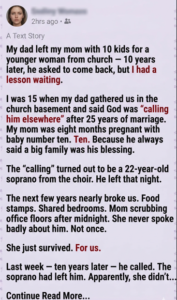 On a random Tuesday, my mom’s name lit up my phone at the exact time she should’ve been in class. She didn’t leave a long message, just one line that made my stomach drop. My father had called. The same man who disappeared from our lives a decade ago. And now, out of nowhere, he wanted to come home.