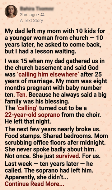 By the time I walked into the kitchen, half my siblings were pretending not to eavesdrop. Mom sat at the table with her phone in front of her like it might bite. Her eyes were red, but her voice stayed steady when she said, “He wants to come home.”