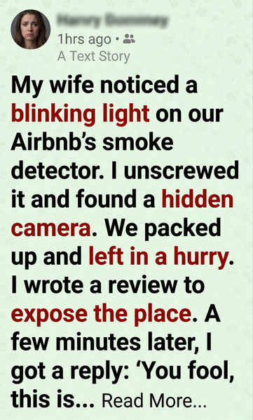 While staying at an Airbnb, the narrator’s wife noticed a faint, blinking light on the smoke detector. It seemed insignificant at first, but curiosity—and an underlying unease—prompted him to climb up and investigate. What he discovered made his heart pound: a tiny lens hidden inside the device, unmistakably a camera.