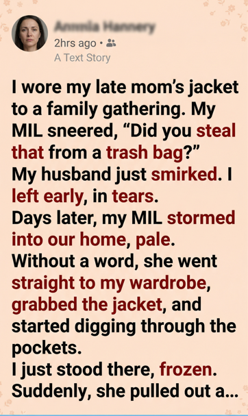 After that, the jacket returned to my closet, respected and untouched. My mother-in-law never mocked my mother again.