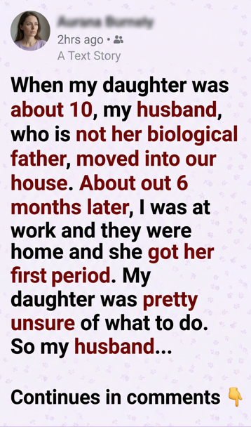 When my daughter was about 10, my husband, who is not her biological father, moved into our house. About 6 months later, I was at work and they were home when she got her first period. My daughter was pretty unsure of what to do.