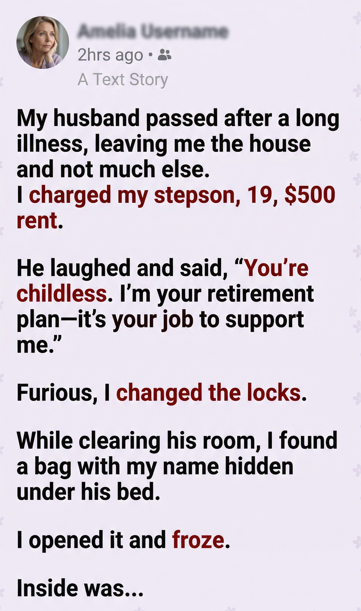 Trying to keep busy, I began packing his room. I folded clothes, boxed books. When I bent down to check beneath the bed, my hand brushed against a small duffel bag shoved far into the shadows. My name was written on it.