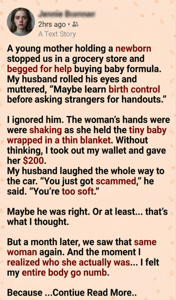 She explained that a month ago had been the worst day of her life. Her husband had suddenly passed away, and she had been left alone with a newborn and no nearby family. Her bank account had been temporarily frozen due to paperwork issues after his death, and she couldn’t access her money.