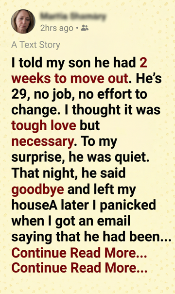 For years, I had watched him waste time, sleeping late, playing games, and ignoring every chance to build a future. I was frustrated and scared he would never change. That’s why I gave him those two weeks. I thought it was the only way.