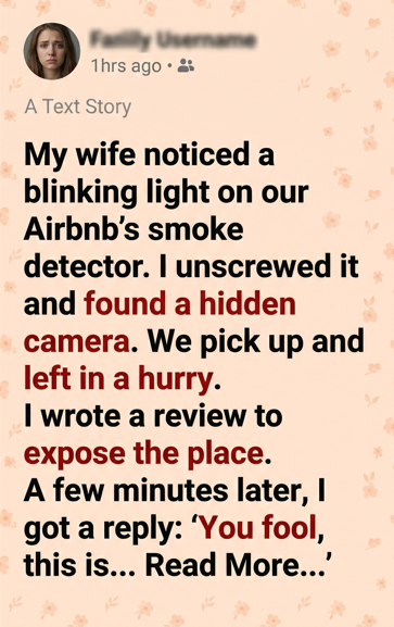 While staying at an Airbnb, the narrator’s wife noticed a faint, blinking light on the smoke detector. It seemed insignificant at first, but curiosity—and an underlying unease—prompted him to climb up and investigate. What he discovered made his heart pound: a tiny lens hidden inside the device, unmistakably a camera.