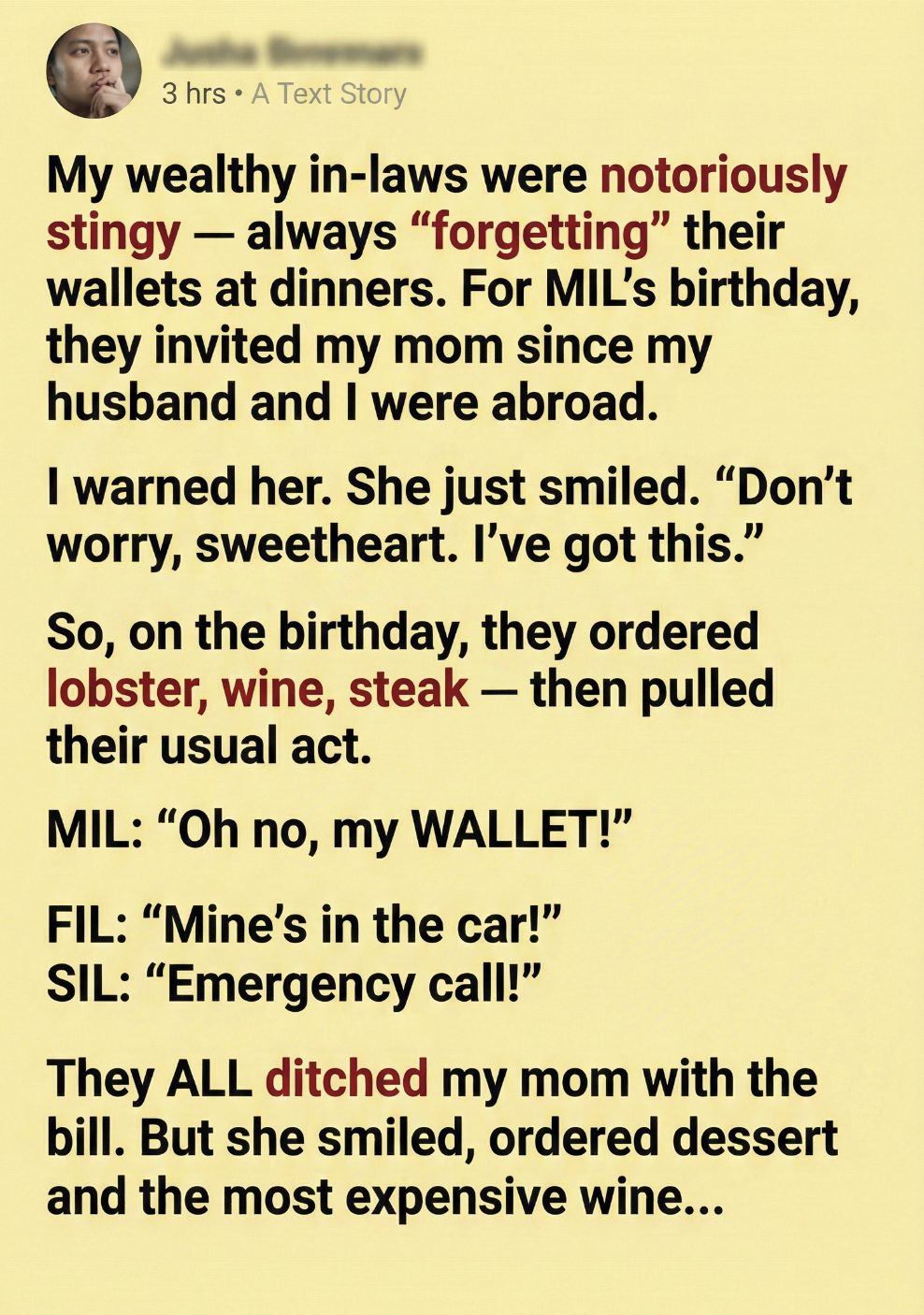 My mom sat alone at a table covered in empty wine glasses and half-eaten plates — with the entire bill placed neatly in front of her.