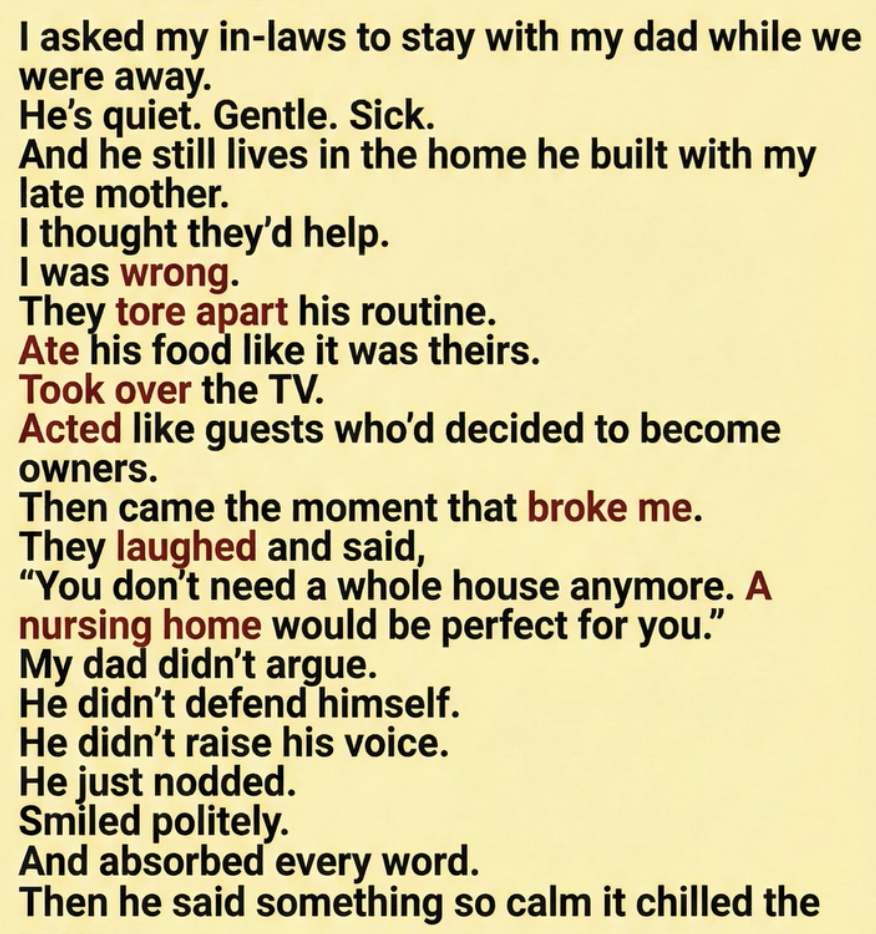 From the moment we left, they treated his home like a place they were entitled to. They ignored his routine — the simple structure that keeps his days steady. They ate his food without asking. Took over the TV. Rearranged his space. Changed the thermostat. Moved things that mattered to him because they “looked old.”