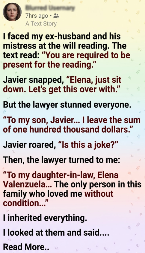 The heavy oak door of the notary’s office felt like a barrier between two worlds, separating the quiet sanity of the hallway from the suffocating toxicity waiting inside, yet I walked through it knowing that my ex-husband, his mistress, and his mother would be waiting like vultures circling a carcass. I showed up anyway, not because I wanted to see the faces that had haunted my nightmares for the past year, nor because I missed the life I had violently lost, but because the message on my phone had made my stomach drop with a command I couldn’t ignore: “You are required to be present for the reading.” When I finally stepped into the room, the air was thick with the scent of expensive leather and old paper, a smell that usually comforted me but today made me nauseous. I didn’t sit down in the empty chair they had left for me; instead, I stayed standing near the bookshelf with my arms crossed tight against my chest, as if keeping my body rigid enough would prevent my heart from betraying the anxiety thundering against my ribs. The lawyer, Gavin Herrera, looked up from his desk, adjusted his wire-rimmed glasses, and spoke with a professional calm that contrasted sharply with the tension in the room, looking directly at me to say, “Mrs. Valenzuela… I’m glad you decided to join us.”