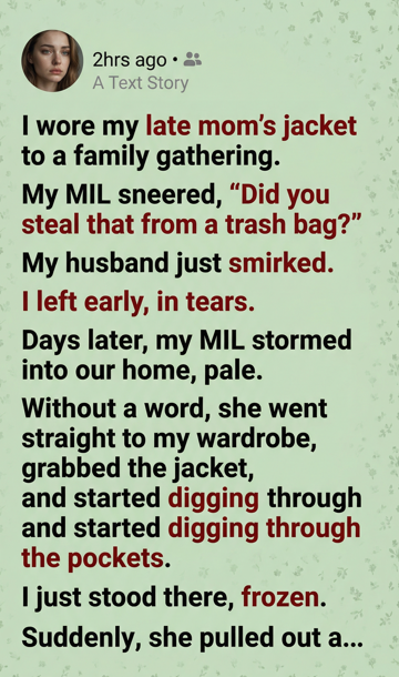 After that, the jacket returned to my closet, respected and untouched. My mother-in-law never mocked my mother again.