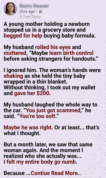 She explained that a month ago had been the worst day of her life. Her husband had suddenly passed away, and she had been left alone with a newborn and no nearby family. Her bank account had been temporarily frozen due to paperwork issues after his death, and she couldn’t access her money.