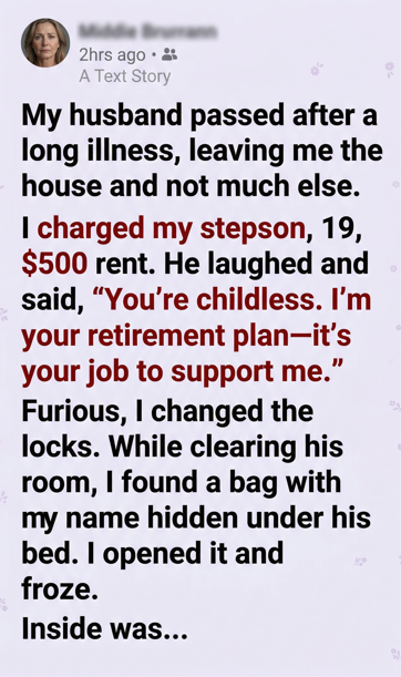 Trying to keep busy, I began packing his room. I folded clothes, boxed books. When I bent down to check beneath the bed, my hand brushed against a small duffel bag shoved far into the shadows. My name was written on it.