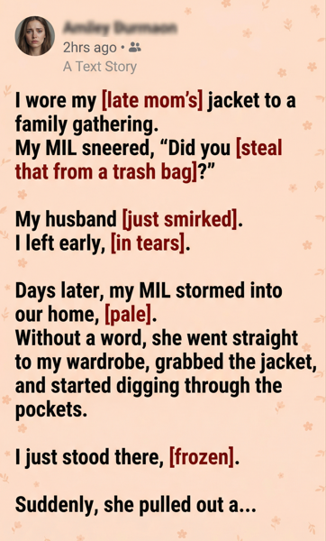 Then, a few days later, she stormed into my house without warning. She ignored me, rushed to my closet, and grabbed the jacket, rifling through the pockets. I froze, watching her violate the last tangible piece of my mother.