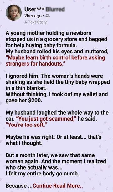 She explained that a month ago had been the worst day of her life. Her husband had suddenly passed away, and she had been left alone with a newborn and no nearby family. Her bank account had been temporarily frozen due to paperwork issues after his death, and she couldn’t access her money.