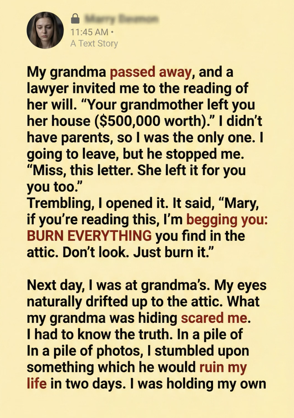 I didn’t expect much. I had no parents — they’d died when I was young — and my grandma had been my whole world. I assumed the house would be sold to cover debts or medical bills.