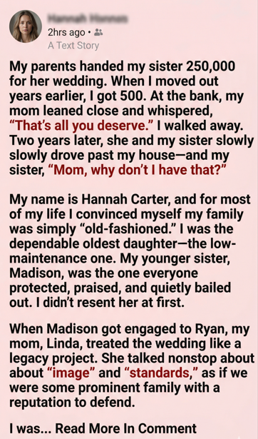 My parents handed my sister $250,000 for her wedding. When I moved out years earlier, I got $500. At the bank, my mom leaned close and whispered, “That’s all you deserve.” I walked away. Two years later, she and my sister slowly drove past my house—and my sister cried, “Mom, why don’t I have that?”