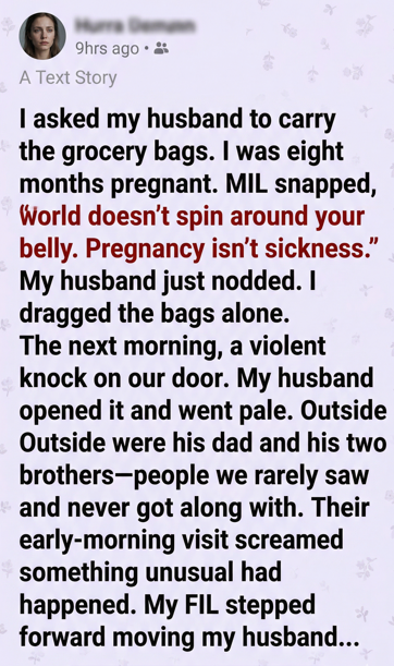 It wasn’t a dramatic request. Just a quiet, exhausted one—my back aching, my ankles swollen, the baby pressing low and heavy. The bags were full of ordinary things: rice, milk, vegetables, prenatal vitamins. Life things.