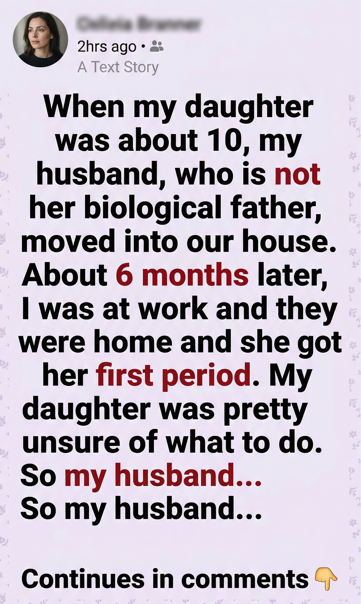 When my daughter was about 10, my husband, who is not her biological father, moved into our house. About 6 months later, I was at work and they were home when she got her first period. My daughter was pretty unsure of what to do.