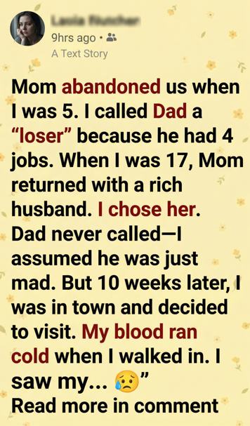 When I saw him, tubes everywhere, face pale and thinner than I remembered, my knees nearly gave out. I broke down, sobbing, begging him to forgive me for leaving. For choosing my mother. For calling him a loser.