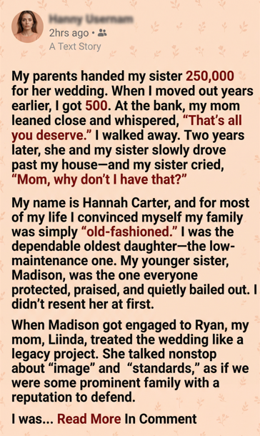My name is Hannah Carter, and for most of my life I convinced myself my family was simply “old-fashioned.” I was the dependable oldest daughter—the low-maintenance one. My younger sister, Madison, was the one everyone protected, praised, and quietly bailed out. I didn’t resent her at first.