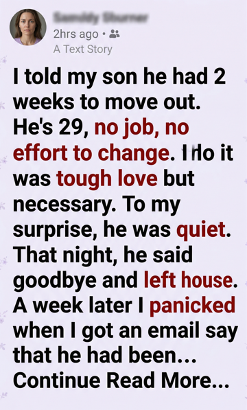 For years, I had watched him waste time, sleeping late, playing games, and ignoring every chance to build a future. I was frustrated and scared he would never change. That’s why I gave him those two weeks. I thought it was the only way.