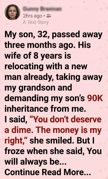 She looked down for a moment. “You think it’s easy? You think I wanted this?” she whispered. “Every day I wake up and remember he’s gone. But our son still needs stability. He still needs a future.”