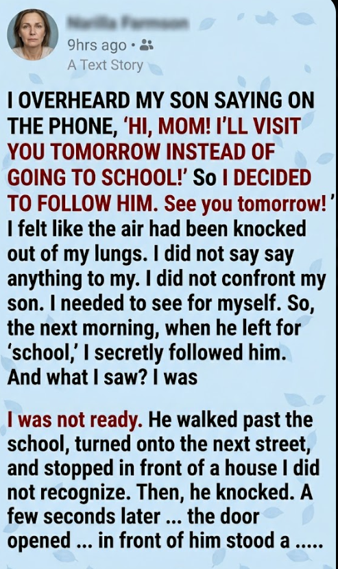 I OVERHEARD MY SON SAYING ON THE PHONE, ‘HI, MOM! I’LL VISIT YOU TOMORROW INSTEAD OF GOING TO SCHOOL!’ So I DECIDED TO FOLLOW HIM. See you tomorrow! ’ I felt like the air had been knocked out of my lungs. I did not say anything to my husband. I did not confront my son. I needed to see for myself. So, the next morning, when he left for ‘school,’ I secretly followed him. And what I saw? I was not ready. He walked past the school, turned onto the next street, and stopped in front of a house I did not recognize. Then, he knocked. A few seconds later … the door opened … in front of him stood a …..