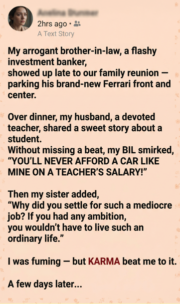 At a recent family reunion, my brother-in-law, Tom, a successful yet arrogant lawyer, decided to belittle my husband, David, a humble teacher. Tom’s wealth, flaunted through his flashy Ferrari, often made him the center of attention, and this year was no different.
