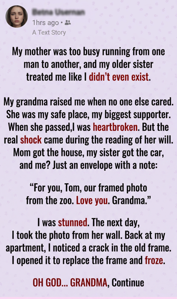 The next day, I went back to her house while my mom and sister were busy arguing over furniture. I took the framed photo from the wall—the one of us at the zoo when I was ten. I was grinning, missing a tooth. Grandma had her arm around me, eyes crinkled with joy.