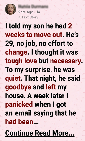 For years, I had watched him waste time, sleeping late, playing games, and ignoring every chance to build a future. I was frustrated and scared he would never change. That’s why I gave him those two weeks. I thought it was the only way.