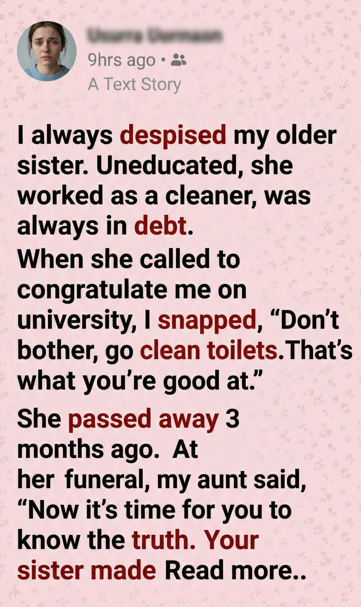 I always despised my older sister. That truth sits in my chest like a stone, heavy and impossible to move.