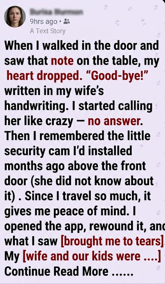 When I walked in the door and saw that note on the table, my heart dropped. “Good-bye!” written in my wife’s handwriting. I started calling her like crazy — no answer. Then I remembered the little security cam I’d installed months ago above the front door (she did not know about it). Since I travel so much, it gives me peace of mind.