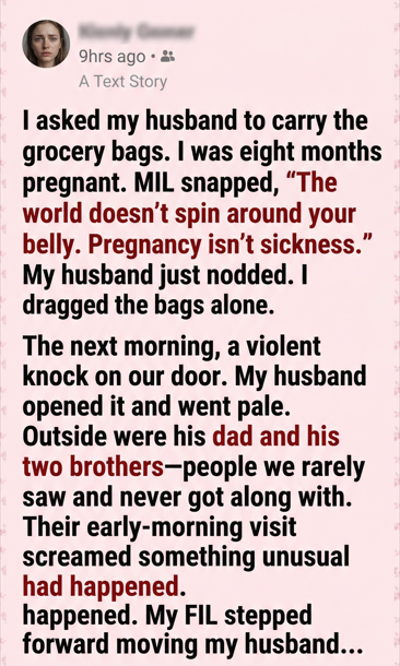 It wasn’t a dramatic request. Just a quiet, exhausted one—my back aching, my ankles swollen, the baby pressing low and heavy. The bags were full of ordinary things: rice, milk, vegetables, prenatal vitamins. Life things.