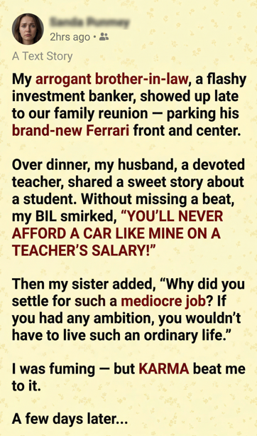 At a recent family reunion, my brother-in-law, Tom, a successful yet arrogant lawyer, decided to belittle my husband, David, a humble teacher. Tom’s wealth, flaunted through his flashy Ferrari, often made him the center of attention, and this year was no different.