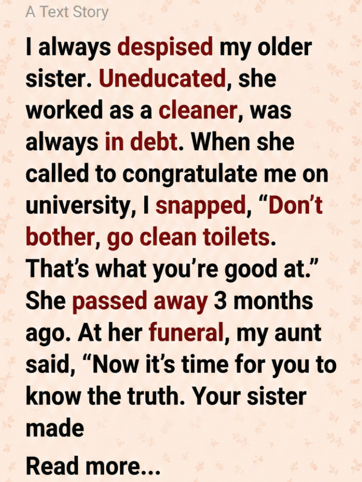 “She never got a proper education or a good job because she wanted you to have it all,” my aunt said softly. “It was a family secret. She forbade everyone from telling you. She said if you knew, you’d feel pressured. Or guilty. She wanted you to succeed freely.”